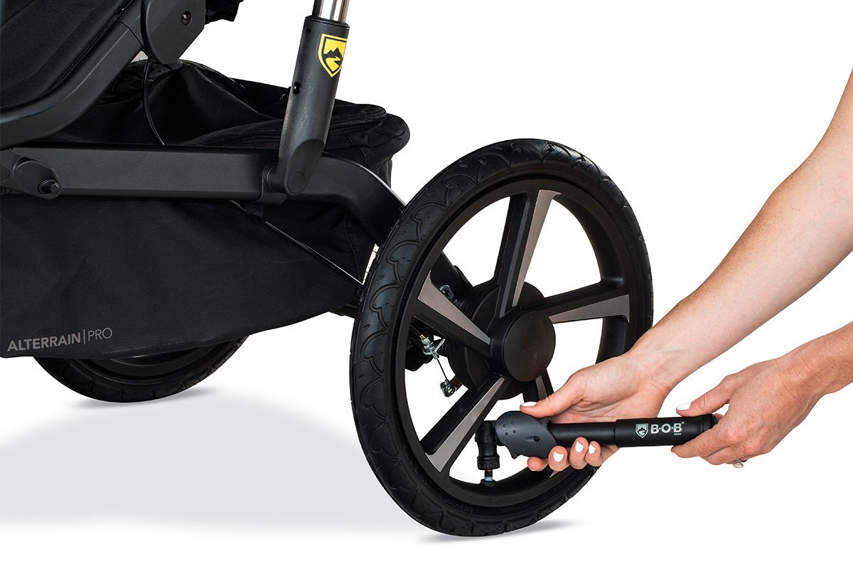 Invest in the Deluxe Handlebar Console (includes tire pump) for single jogging strollers or a portable bike pump to keep on hand for on-the-go adjustments.